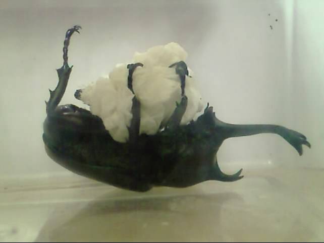 蟲叔叔把飼育箱的土全翻出來,濾出了10隻「一齡幼蟲」(2~3週大),土已變質,還有異樣的塊狀,密密麻麻的螨蟲活力充沛地鑽來鑽去。偶而看到零星的獨角仙殘屍,真的「成仙」了。