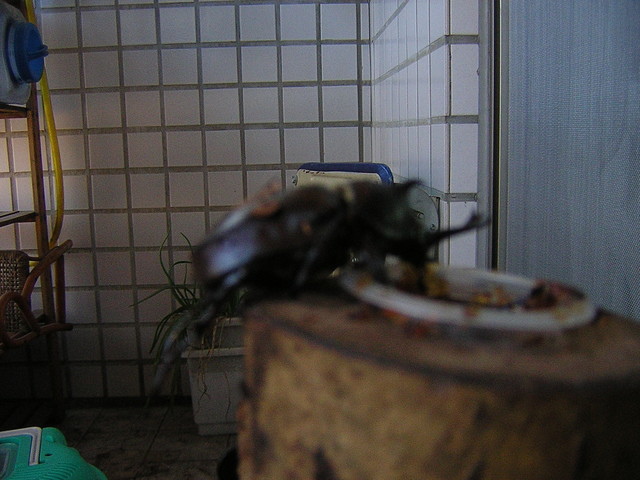豈知第二天一大早,以諾上學前找不到他的愛蟲,焦急地問我有沒有看到牠的蹤影?有的有的,別緊張,牠又把蓋子頂開跑出來了!陽台有紗窗,飛不走的,放學回來再找找吧!以諾稍稍放心了,因為有一位鄰居小朋友,曾經在家裏「走失」了一隻鍬形蟲,一個禮拜之後才在客廳找到!希望這隻仙別失蹤一個禮拜才好!