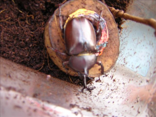 真相如何?推論是:那兩隻我們未曾謀面的獨角仙比後來見到的兩隻羽化得早,因為在同一個飼育箱,牠們相遇後很快就交配產卵了。成蟲若一羽化就交配,常會因體力不支而死去(因為還沒吃東西),而牠們就死在產卵的土裡,我們從外面看不到。成蟲身體的主要成份為「幾丁質」,那是蛋白質的一種,如今成為土裡小螨蟲的食物(這部分是以諾說的),蟲屍便如此被自然分解。